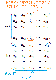 ※ 行列Aの行列式をdet(A)で表す.・・・|A|と書かれることも多い.未知数がn個 x1, x2, x3, ··· , xn ,方程式がn個の連立1次方程式 ![]() ![]() (1) 逆行列を用いる方法 ![]() (1)の簡単な解説 Aの逆行列A−1が存在すれば,