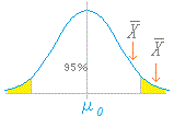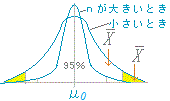 □z値を用いた検定 ⇒ z>1.96またはz<−1.96のときは有意差ありとして,μ=μ0という仮説を棄却する.![]() この式を変形すると, ![]() ![]() □p値を用いた検定 ⇒ 棄却域に入る確率が直接計算できるときは,p<0.05(5%)のときは有意差ありとして,μ=μ0という仮説を棄却する. |