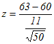 [ポイント]ある県で模擬試験を受けた生徒から50人を無作為抽出してしたところ,平均63点,標準偏差11点であった.このことから,この県の生徒の得点は全国平均60点よりも高いといえるか.有意水準5%で検定せよ. (架空データ) 標本の大きさがn=50だから,母集団の標準偏差は標本の標準偏差に等しいと見なせる.また,正規分布が使える. 超えるのではないかということに関心があるのだから片側検定とする. 片側検定のときは|z|=1.645が境界値となる. (解答) =1.92>1.645だから,帰無仮説は棄却される.したがって,高いといえる.
