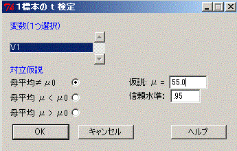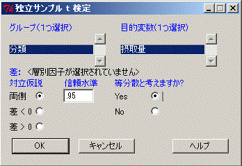 ◇◇F検定の結果を用いてtF検定を行う◇◇ 統計量→平均→独立サンプルt検定→(次の図のように選ぶ) ![]() 出力ウインドウに次にように出力される.