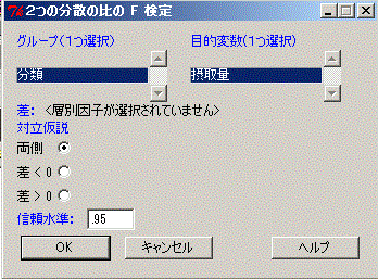 ■Rコマンダーでのt検定![]() ○ そのままのデータでは「対応のない場合のt検定」が選択できないので,右図のようにExcel上で1列に加工する(分類名A,Bで区別する.Aが生,Bが炒ったものに対応)・・・(2) Excel上で(2)の範囲を変転表示にし,コピーし(メモリ=クリップボードに入れる.) ○ Rコマンダーのメニューで データ→データのインポート→テキストファイルまたはクリップボード,URLから データセット名を入力(→例えばxとする) ファイル内に変数名あり(右図の摂取量,分類を含めてコピーしているのならチェックありのまま) データファイルの場所(→クリップボード) フィールドの区切り記号(→タブ) →OK [データセットを表示]で右図下のように表示されればよい. ○ここからがRコマンダーを用いたt検定 ◇◇初めにF検定を行う◇◇ 統計量→分散→分散の比のF検定 →(次の図のように選ぶ) ![]() 出力ウインドウに次にように出力される.