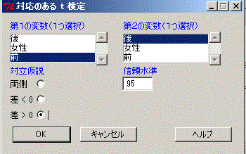 ■Rコマンダーでのt検定 ○Rコマンダーで使うデータは,左の問題の行列を入れ替えたもの(3列11行)の形でよい. 左の問題文のデータをWeb画面上で女〜66.0までをドラッグ・コピーし,Excel上に単純に貼り付けると転記ミスなしに取り込むことができる.次に,Excel上でもう一度コピーし,貼り付け→行列を入れ替える ・・・・・・(1) Excel上で(1)の範囲を変転表示にし,コピーし(メモリ=クリップボードに入れる.) ○ Rコマンダーのメニューで データ→データのインポート→テキストファイルまたはクリップボード,URLから データセット名を入力(→例えばyとする) ファイル内に変数名あり(女性,前,後を含めてコピーしているのならチェックありのまま) データファイルの場所(→クリップボード) フィールドの区切り記号(→タブ) →OK [データセットを表示]で確かめる方がよい. ○ここからがRコマンダーを用いたt検定 統計量→平均→対応のあるt検定 ![]() →(右図のように選ぶ) 出力ウインドウに次にように出力される.
