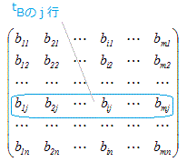 ※ Aの転置行列 (transpose of A)のt.右上に付ければ累乗(べき乗)と紛らわしいためか左上に付ける. (2)(3)(4)は明らか. (1)の証明: ABの( i , j )成分はAのi行とBのj列の積 ![]() ![]() ![]() …(*1)![]() ![]() ![]() ![]() …(*2)![]() |