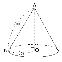 底面の半径がr,円錘の高さがhのとき,円錐の体積Vは,次の公式で求められる.(この公式は覚えます) \(\displaystyle V=\frac{1}{3}\pi r^2h\) この公式を利用するために,あらかじめ円錐の高さhを直角三角形OABについて,三平方の定理を使って求めておきます. \(\displaystyle h^2+3^2=7^2\) \(\displaystyle h=\sqrt{40}=2\sqrt{10}\) このhを公式に代入すると \(\displaystyle V=\frac{1}{3}\pi\times 3^2\times 2\sqrt{10}=6\sqrt{10}\pi(cm^3)\)・・・(答) |