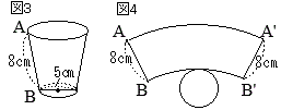 図3のような紙コップを参考に,容器を作ります。紙コップをひらいたら,図4のような展開図になります。図4において,側面にあたる辺ABと辺A'B'をそれぞれ延ばし,交わった点をOとすると,弧BB',線分OB,線分OB'で囲まれる図形が中心角45°のおうぎ形になります。このとき,弧AA'の長さを求めなさい。 ![]() (2023年 滋賀県公立高校入試問題)