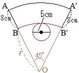 \(\displaystyle r=20 \)\(\displaystyle {\rm AA'}=2\pi\times 28\times\frac{45}{360}=7\pi \)(cm)・・・(答) |