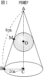 [11]右の図Tのように,底面の半径が2cm,母線の長さが8cmの円錐Pと,円錐Pの内部で側面にぴったりと接している球Oがある。点Oは,円錐Pの頂点Aと底面の中心Cを結ぶ線分AC上にあり,球Oは,円錐Pと母線ABの中点Mで接している。 このとき,次の問いに答えなさい。 問1 円錐Pの高さを求めなさい。 問2 球Oの半径を求めなさい。