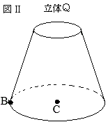 (2) 図Uは,図Tにおいて,円錐の頂点をAとし,線分AO上に,AB:BO=3:2となる点Bをとったものです。この円錐を,点Bをふくむ底面に平行な平面で分けたときにできる2つの立体のうち,円錐の方をP,もう一方の立体をQとします。円錐Pと立体Qの体積の比を求めなさい。