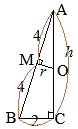 問2 右図において△AMO∽△ACBだから\(\displaystyle 4:r=h:2 \) \(\displaystyle 4:r=2\sqrt{15}:2 \) \(\displaystyle 2\sqrt{15}r=8 \) \(\displaystyle r=\frac{8}{2\sqrt{15}}=\frac{4\sqrt{15}}{15} \)・・・(答) 問3 (1) 円錐の側面の展開図となる扇形の中心角をθとおくと,扇形の円弧の長さ \(2\pi\times 8\times\frac{\theta}{360}\) は底面の円周の長さ \(2\pi\times 2\)に等しい \(\displaystyle 2\pi\times 8\times\frac{\theta}{360}=2\pi\times 2 \) \(\displaystyle \theta=90\)° 円錐台の側面積は \(\displaystyle \pi\times 8^2\times\frac{90}{360}-\pi\times 4^2\times\frac{90}{360}=16\pi-4\pi\) \(=12\pi\)(cm2)・・・(答)