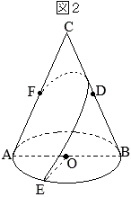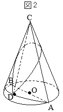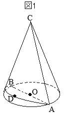 (ウ) この円すいの側面上に,図2のように点Dから線分AC,線分BCと交わるように点Dまで円すいの側面上に引いた線のうち,長さが最も短くなるように引いた線の長さを求めなさい。