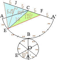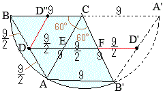 イで計算したように,扇形BCB'の中心角は\(\displaystyle \theta=120\)(°)だから,右図において∠BCA=∠ACB'=60°になる さらにBC=AC=B'C=9だから△ACB, △B'CAはいずれも正三角形になり,