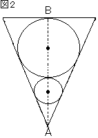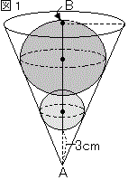 [8]右の図1のように,頂点がA,高さが12cmの円すいの形をした容器がある。この容器の中に半径rcmの小さい球を入れると,容器の側面に接し,Aから小さい球の最下部までの長さが3cmのところで止まった。 次に,半径2rcmの大きい球を容器に入れると,小さい球と容器の側面に接して止まり,大きい球の最上部は底面の中心Bにも接した。