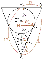 【円錐に接する球】==[考え方]★★★:難しい,[計算量]☆☆☆:多い== (1) 右の図において,円錐の高さは12cmだから \(\displaystyle 3+2r+4r=12\) \(\displaystyle 6r=9\) \(\displaystyle r=\frac{9}{6}=\frac{3}{2}\)・・・(答) (2) △AB'C'はC'が直角の直角三角形だから,AC'=ℓとおくと,三平方の定理により \(\displaystyle (3+r)^2=r^2+\mathscr{l}^2\) \(\displaystyle 9+6r+r^2=r^2+\mathscr{l}^2\) \(\displaystyle \mathscr{l}^2=9+6r=9+6\times\frac{3}{2}=18\) \(\displaystyle \mathscr{l}=\sqrt{18}=3\sqrt{2}\) 公式を覚えているだけでは,問題は解けない!なかなか手強い問題だ! 図のLを求めてから,三平方の定理でRを求めてもよい \(\displaystyle {\rm BC}=R\)とおくと \(\displaystyle \mathscr{l}:r=12:R\) \(\displaystyle 3\sqrt{2}:\frac{3}{2}=12:R\) \(\displaystyle 3\sqrt{2}R=\frac{3}{2}\times 12=18\) \(\displaystyle R=\frac{18}{3\sqrt{2}}=3\sqrt{2}\)(cm)・・・(答) (3) \(\displaystyle {\rm △C''HB'}\)∽\({\rm △AC'B'}\)だから \(\displaystyle {\rm B''C'':HC''=B'A:C'A}\) \(\displaystyle 2r:{\rm HC'}=(r+3):\mathscr{l} \) \(\displaystyle 2\times \frac{3}{2}:{\rm HC'}=(\frac{3}{2}+3):3\sqrt{2} \) \(\displaystyle 3:{\rm HC'}=\frac{9}{2}:3\sqrt{2} \) \(\displaystyle \frac{9}{2}{\rm HC'}=9\sqrt{2} \) \(\displaystyle {\rm HC'}=2\sqrt{2} \) これが半径だから円周の長さは \(\displaystyle 2\pi\times 2\sqrt{2}=4\pi\sqrt{2} \)(cm)・・・(答) |