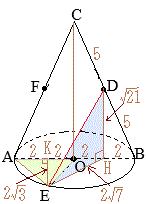 D,E間の距離は,空間における直線であることに注意するDからOBに引いた垂線の足をH,EからOAに引いた垂線の足をKとおく。 はじめに,△DHBは∠H=90°の直角三角形で,HB=2, DB=5だから \(\displaystyle {\rm DH^2}=5^2-2^2=21\) \(\displaystyle {\rm DH}=\sqrt{21} \) 次に,△AEOは正三角形で,KO=2, OE=4だから \(\displaystyle {\rm EK^2}=4^2-2^2=12 \) \(\displaystyle {\rm EK}=\sqrt{12}=2\sqrt{3} \) さらに,△EKHは∠K=90°の直角三角形で,\(EK=2\sqrt{3}\),KH=4だから \(\displaystyle {\rm EH^2}=4^2+(2\sqrt{3})^2=28 \) \(\displaystyle {\rm EH}=\sqrt{28}=2\sqrt{7} \) 最後に,△DHEは∠H=90°の直角三角形で,\(DH=\sqrt{21},EH=2\sqrt{7}\)だから \(\displaystyle {\rm ED^2}=(\sqrt{21})^2+(2\sqrt{7})^2=21+28=49 \)→ 2 ・・・(答) \(\displaystyle {\rm ED}=7 \)(cm) (ウ)==[考え方]★★★:難しい,[計算量]☆☆:普通==
