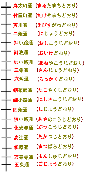 【京の通り】(文章から数学へ) むかし,京にやってきた旅人が,京の人に道を尋ねたところ,「おあがりやす」「おさがりやす」と言われたので,はしごを買って昇ったり降りたりしたという笑い話があります.もちろん「おあがりやす」とは「北に進みなさい」,「おさがりやす」とは「南に進みなさい」という意味です. 京では小さな通り1本を「一筋」と言います.例えば,御池通から「二筋あがる」と,二条通に来ます. 京の通りの名前は「まる たけ えびす に おし おいけ,あね さん ろっかく たこ にしき,し あや ぶつ たか まつ まん ごじょう」といった数え歌で覚えることができます.この数え歌は,京の通り名を丸太町通から南へ順に言い表わしたものです. さて,修学旅行で京都に来た中学生数人が一つの班になって買い物をすることになったとします.旅館は御池通にあるとして,ここを出発点(原点)にします.一つ買い物をするたびに道を尋ねた結果,次のように言われました. 全部の買い物が済んだとき,どこにいるでしょう.「地図をクリックして」答えなさい. |