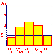 次の度数分布表を右のようなヒストグラムにするとき,階級60以上70未満に対応する