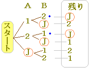 裏返しにした3枚のカードの中に1枚だけジョーカが入っている.A,B2人がこの順にカードを取り,取ったカードは戻さないものとする.このとき,A,Bの少なくとも1人がジョーカを取る確率を求めなさい.