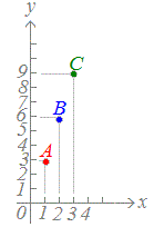 この表にはデータが3組ありますので、点が3個できることになります。