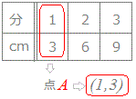 - 1分後に3(cm)までたまったことは、x=1 , y=3となる点(1 , 3)で表されます。(図の点A)