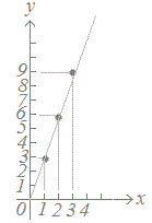 例えば、右の表3をグラフにして、なめらかな線で結ぶと図3のようになり、y=3xの関係があると予想できます。これにより、x=4のときy=12になると予想できます。