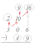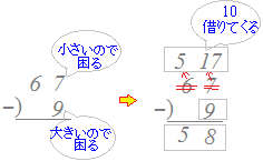 のような計算では,引かれる方の1の位の数7よりも,引く方の1の位の数9の方が大きいので,そのままでは1の位の引き算が難しくなります.このような場合,10の位の数6を5と1に分けて