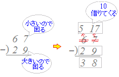 のような計算では,上の【例1】と同じように,「10を借りてきて」1の位の計算を行います.