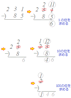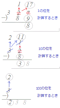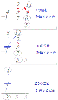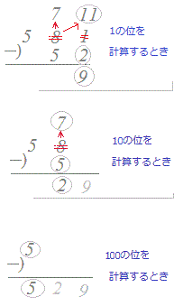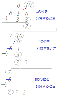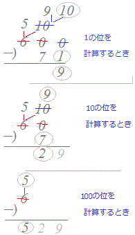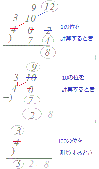 のように,10の位から借りてくることができないときは,さらに100の位から借りてきて,10の位,1の位に乗せていきます.