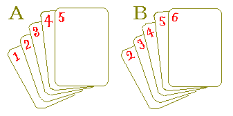 右の図のように,Aさんは1,2,3,4,5の数字が,B君は2,3,4,5,6の数字が書かれた5枚のカードを持っている.2人が5枚のカードをそれぞれよくきり同時に1枚ずつ出して,大きい数の方が勝ち,小さい数の方が負け,同じ数ならば引き分け,というゲームを行う.