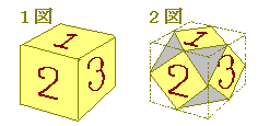 右の1図のように,1から6までの整数が1つずつ書かれた立方体のさいころがある.このさいころを,各頂点に集まる3辺の中点を通る平面で切り取り,2図のような立体をつくる.