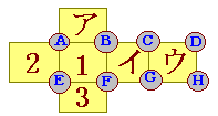 3. 次の展開図に示されたA〜Hの各部分に,隣り合う3面に書かれた数の合計を書きなさい.