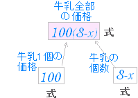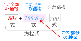 ■ 方程式の文章題(式の練習) 【はじめに】 x の方程式では,左辺と右辺が等しくなるような x の値を求めます. 例 1個 80 円のパンと1個 100 円の牛乳を合計 8個買うと合計 700 円になった.パンを何個買ったか求めたいとき,パンを x 個買ったとすると,