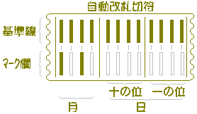 | 自動改札切符は,基準線を4つずつ区切り,マークの組み合わせによって2進法で日付などがわかるしくみになっている.下の図は,これを模式的に表わしたものであり,基準線の下のマークがぬりつぶしてあれば1,なければ0を表わす.