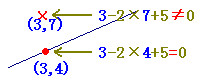 直線の方程式 x−2y+5=0 に点(3,7)の座標x=3,y=7を代入すると,3−2×7+5=−6 つまり 3−2×7+50 だから,直線x−2y+5=0は点(3,7)を通りません