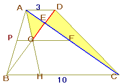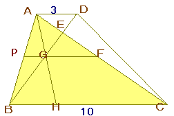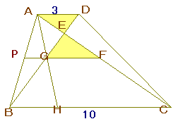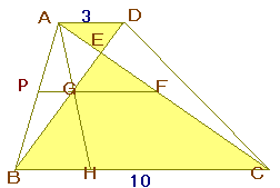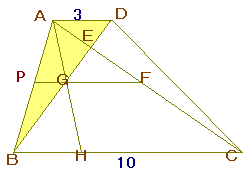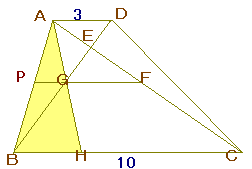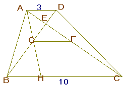 図のように,AD BC,AD=3cm,BC=10cmの台形ABCDがある.対角線AC,DBの交点をEとする.また,AC,DBの中点をそれぞれF,Gとし,AGの延長とBCの交点をHとする. 次の問に答えなさい. (1) 線分BHの長さを求めなさい. (2) 線分GFの長さを求めなさい. (3) △AGEの面積をS,△DECの面積をTとするとき,SとTの比を最も簡単な整数の比で表わしなさい.(「兵庫県 平成11年度」問題の引用) |  |