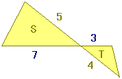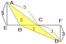 《答える前に》 (準備体操) 三角形の面積=(底辺)×(高さ)÷2です. だから,底辺の長さが等しい右図の2つの三角形△ABCと△DCBでは,面積の比は,高さの比に等しくなります. また,右図のACDが直線でAC:CD=5:3のとき,「相似図形」の性質として,高さの比AE:DFは斜辺の比AC:CDに等しいので,△ABC:△DCBの面積比は5:3となります. |  | | さらに,底辺も高さも異なる右図のような三角形では,底辺の比が7:3で,高さの比は5:4なので,S:T=35:12となります.−−−(ウ) |  |