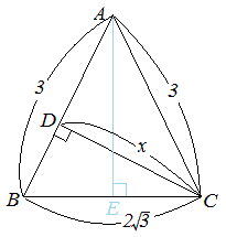 △ABC はAB=AC の二等辺三角形だから,A からBC に垂線BE をひくとAE⊥BC,BE=EC=3 になる.さらに相似図形の性質を使えば,次の図 DC の長さも求められる. ![]() 直角三角形ABE に三平方の定理を適用すると