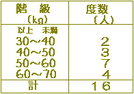 右の表は,あるクラスの男子生徒の体重を度数分布表にまとめたものです.このクラスの男子生徒の体重の平均値は何kgか,四捨五入して小数第1位まで求めなさい.