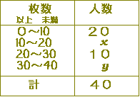 右の表は,あるクラスの生徒が正月に出した年賀状の枚数を度数分布表にまとめたものです.このクラスの生徒が1人平均14.5枚の年賀状を出したことが分かっているとき,x,yを求めるには,