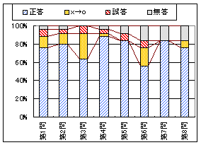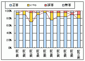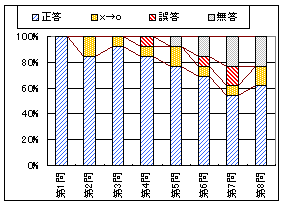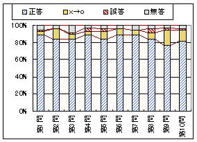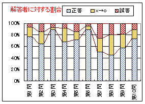 左のグラフ1は問題ごとの正答,誤答,無答の割合(正誤は最初の採点)で,黄色で示したものは初め誤答で再試行の結果正答に変った割合を表わす.