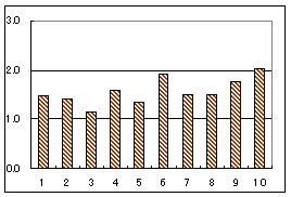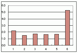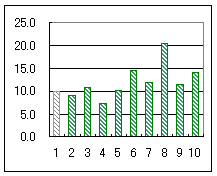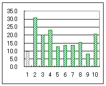 グラフ2は横軸が問題番号,縦軸は直前の操作以降その問題の採点までの所要時間(秒)を表わす.ただし,第1問は初めからの時間.