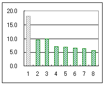 グラフ3は問題ごとの試行回数を表わす.(ただし,同一問題を16回以上試行した答案については16回と見なす.)