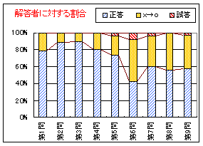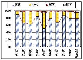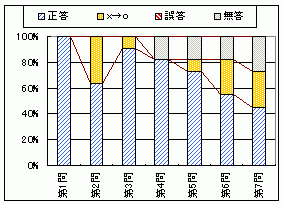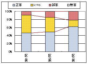 左のグラフ1は問題ごとの正答,誤答,無答の割合(正誤は最初の採点)で,黄色で示したものは初め誤答で再試行の結果正答に変った割合を表わす.この頁については無答答案が多いので,各問題の解答者に対する割合も下に示す.