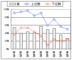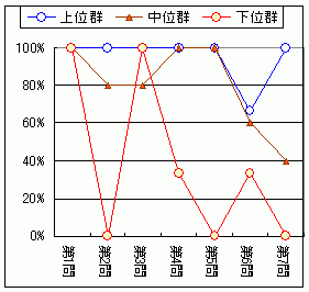 グラフ5は合計得点によって回答者全体を上位群,中位群,下位群(各33%)に分けたときの群別・問題別正答率を示す.