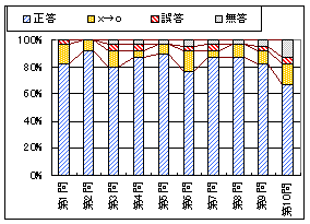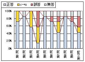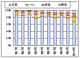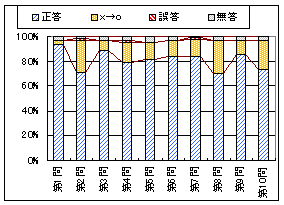 左のグラフ1は問題ごとの正答,誤答,無答の割合(正誤は最初の採点)で,黄色で示したものは初め誤答で再試行の結果正答に変った割合を表わす.