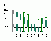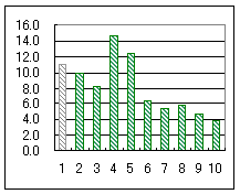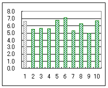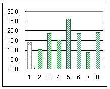 グラフ2は横軸が問題番号,縦軸は直前の操作以降その問題の採点までの経過時間(秒)を表わす.ただし,第1問は初めからの時間.