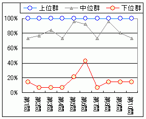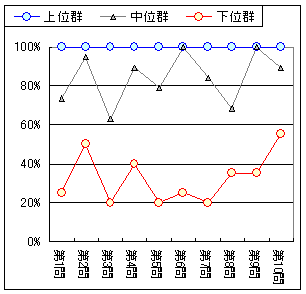 また,グラフ4は合計得点によって回答者を上位群,下位群(各27%),中位群(残り)に分けたときの問題別正答率である.