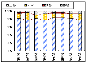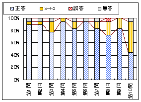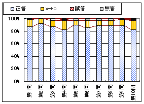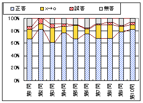 左のグラフ1は問題ごとの正答,誤答,無答の割合(正誤は最初の採点)で,黄色で示したものは初め誤答で再試行の結果正答に変った割合を表わす.