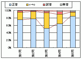 左のグラフ1は問題ごとの正答,誤答,無答の割合(正誤は最初の採点)で,黄色で示したものは初め誤答で再試行の結果正答に変った割合を表わす.