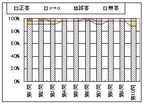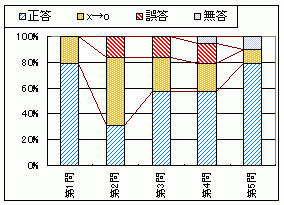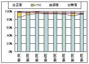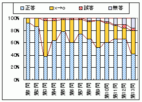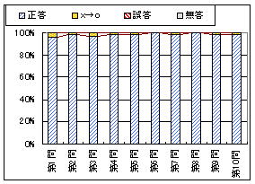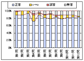 左のグラフ1は問題ごとの正答,誤答,無答の割合(正誤は最初の採点)で,黄色で示したものは初め誤答で再試行の結果正答に変った割合を表わす.