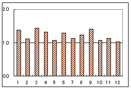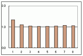 表1は異なる期間における各問題の正答数(件数)の一覧で,この表によりχ2で独立性の検定を行うとp=0.9999となり,期間による有意差はなく(帰無仮説採択)消極的根拠ながら再現性が認められる.